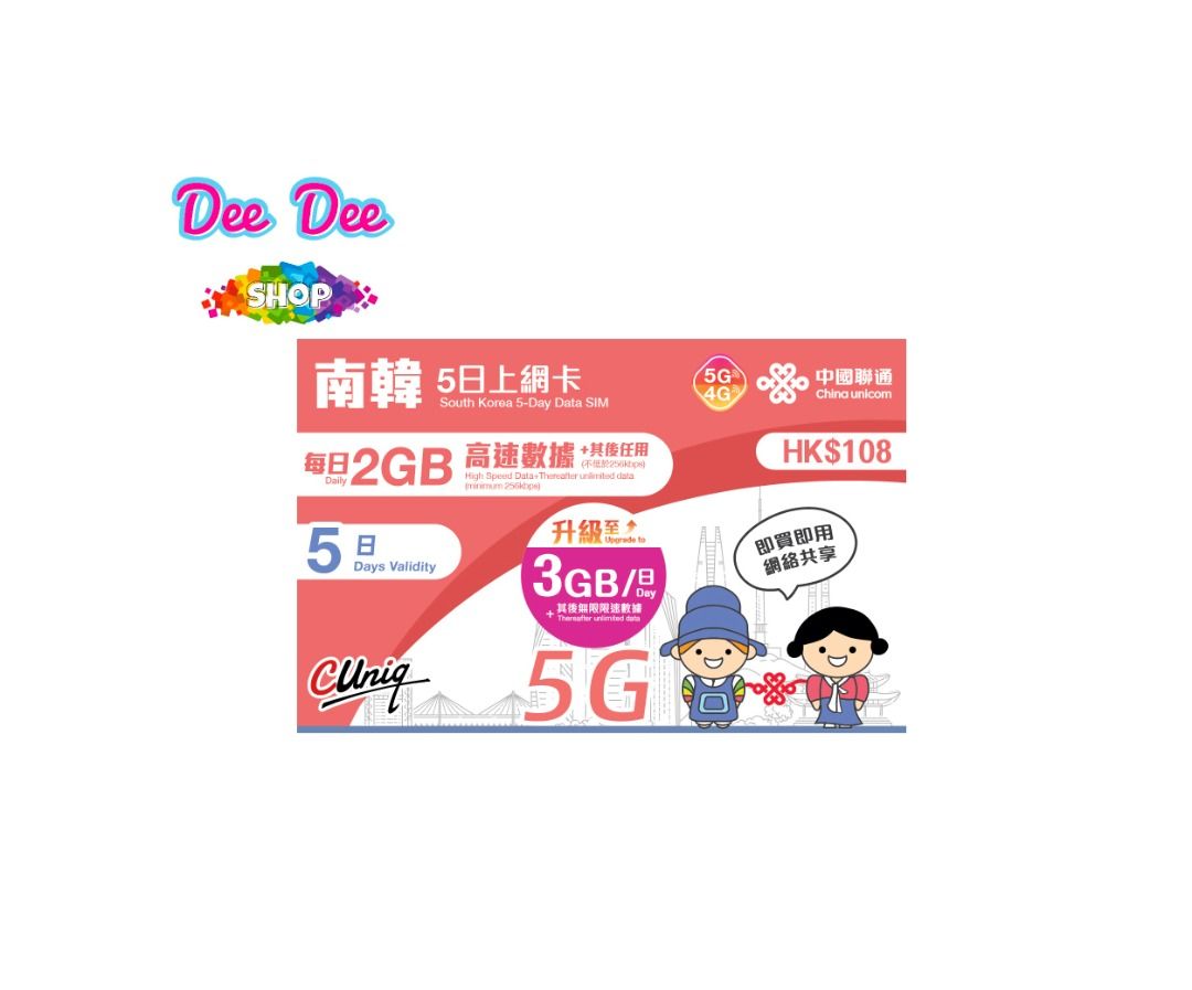 中國聯通 5G/4G 南韓5日 每日3GB高速 無限上網卡