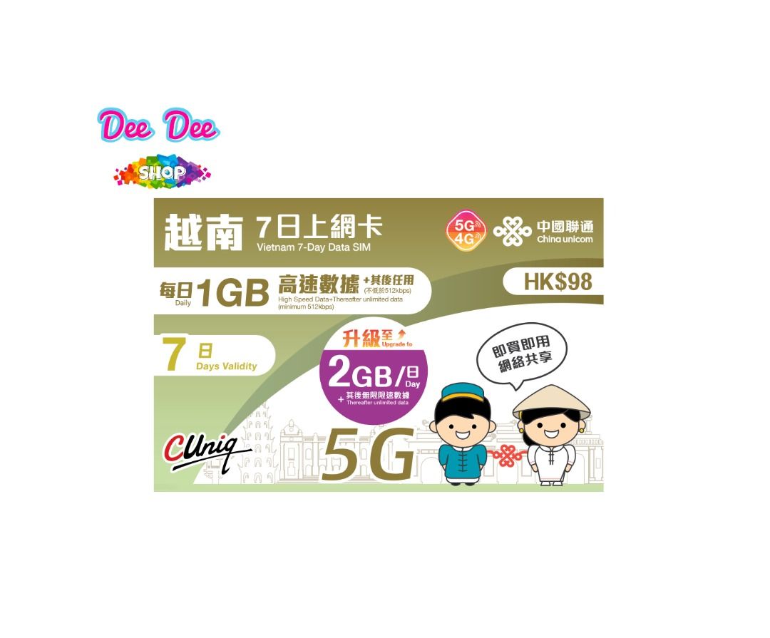 中國聯通 5G/4G 越南7日 每日2GB高速 無限上網
