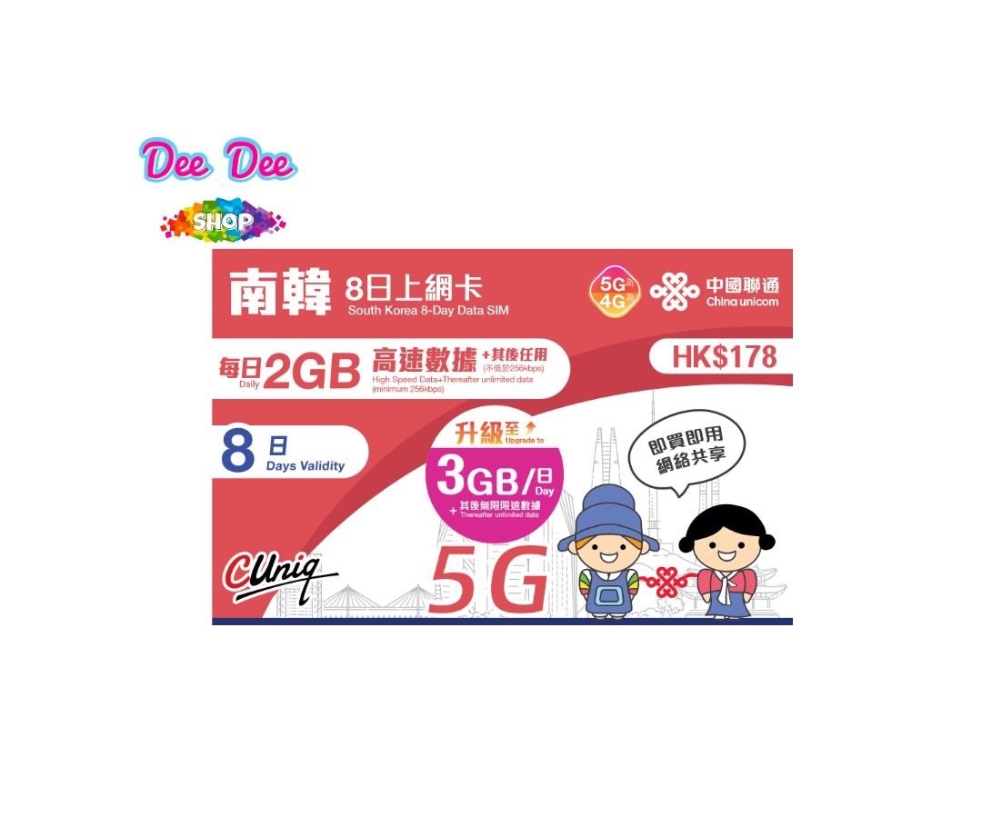 中國聯通 5G/4G 南韓8日 每日3GB高速 無限上網卡
