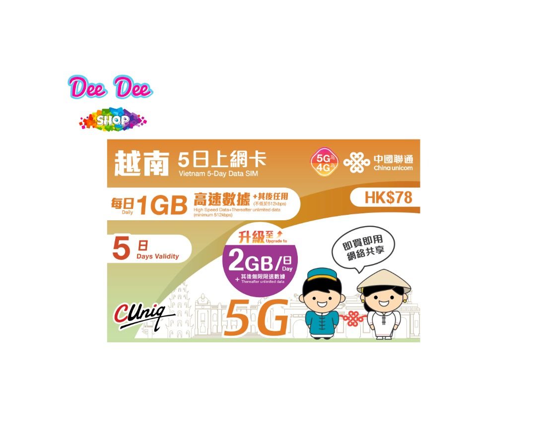 中國聯通 5G/4G 越南5日 每日2GB高速 無限上網